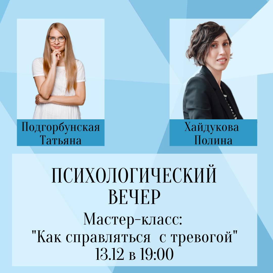 Друзья, приглашаем на новый психологический вечер! Тема: «Как пережить тревогу».
